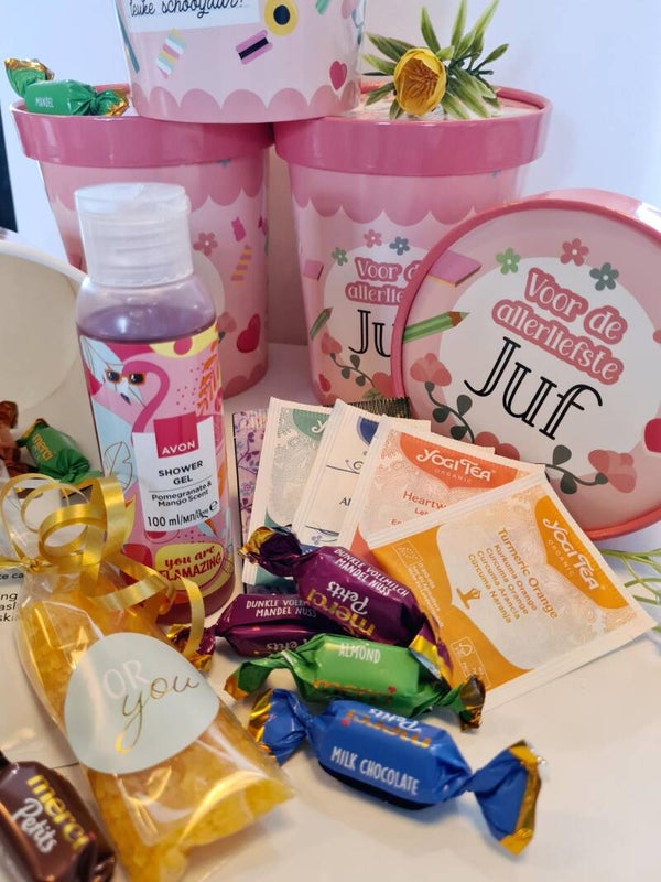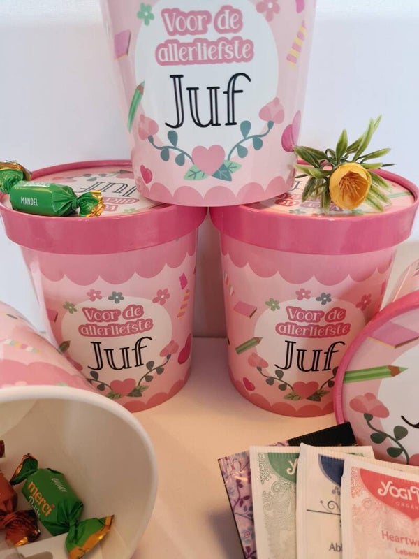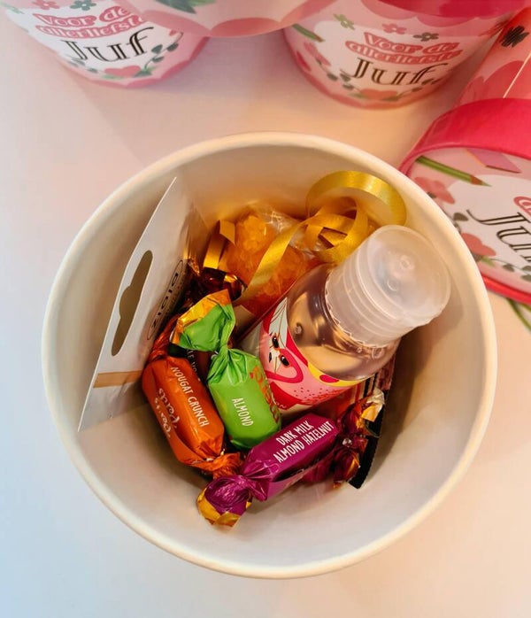 Hoe leuk zijn deze papieren buckets gevuld met leuke producten voor de allerliefste juf!