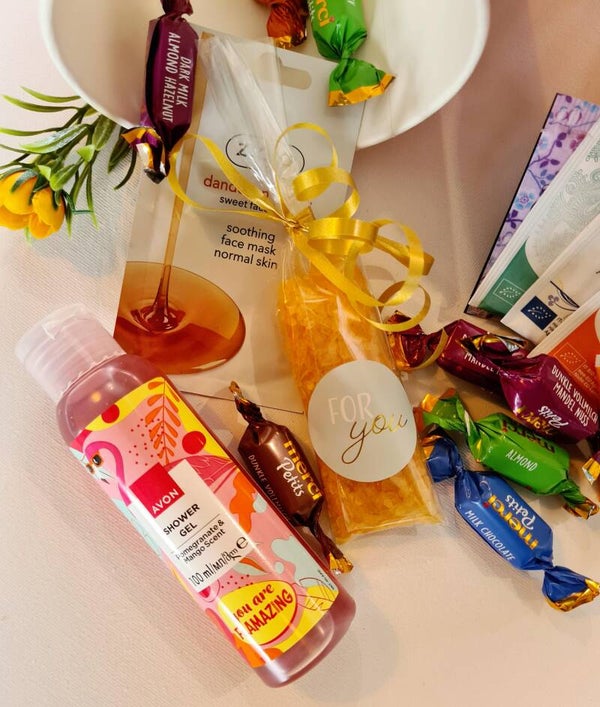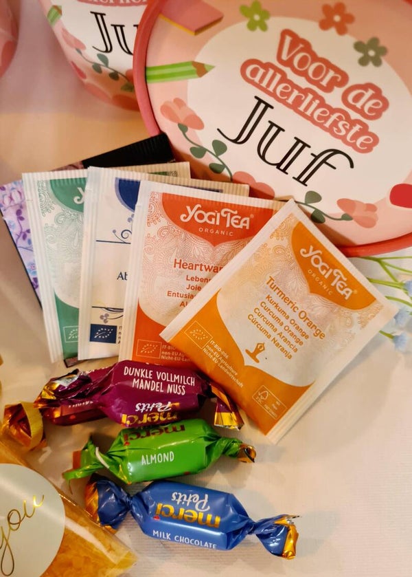 In de bucket stoppen wij 5 zakjes thee in verschillende smaken, een zakje badzout wat je ook voor een ontspannen voetenbadje kunt gebruiken. Een gezichtsmaskertje en hoe leuk is deze douchegel? You are Flamazing! Natuurlijk kunnen de mini Merci's niet ontbreken.